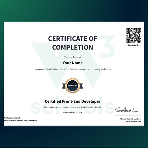Ready to take the exam and become a certified Front-End Developer?  Get 4 certifications in total (HTML, CSS, JavaScript and Front-End developer)